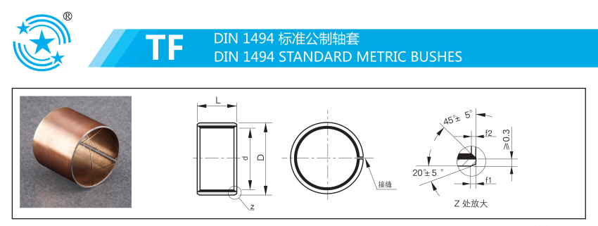 TF-1B青銅合金軸承,是以銅基板為基體材料,用特殊工藝表面燒結 CuPb10Sn10+C材料的鋼銅合金新一代改良產品。做成襯套后,具有JF-800雙金屬軸承的耐壓、耐磨性能,經過石墨散嵌后達到了無給油潤滑的作用。在少油條件下磨擦系數較少,完全防御咬軸的現象,該產品適用于橡膠輪胎模具的導向部位,升降設備的滑動部位,水輪機的高速滑動部們等高溫、高速、不能長期加油的場合。